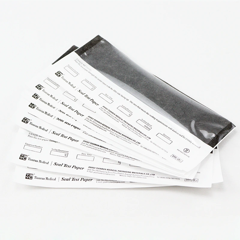 - Principle of product: The principle of the seal test paperis to judge whether the peel strength of the paper-plastic packaging bag meets the requirements based on the visual perception of the sealed area before and after heat sealing.The black printed area of the seal testpaperhasclearlyandevenlydistributed white spots. After heat sealing,if the color of the sealed area darkens and the white/black spots are clearly and evenly distributed, it indicates that the film and paper are tightly sealed and the sealing equipment is in good condition; if there is no change in the color of the sealed area or the white/black spots are indistinctly and unevenly distributed, it means that the film and paper are not completely bonded.